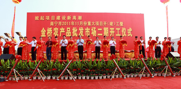 上午11時,劉長林副書記公布南寧金橋農產物批發(fā)市場二期正式開工。即刻,整個建樹工地禮炮齊鳴,鼓樂喧天,一片喜悅。出席開工典禮的率領配合為開工項目剪彩。